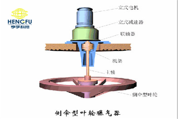 此类曝气机由电动机、立式减速机、机架、联轴器、主轴、倒伞型叶轮和控制柜等组成,具有结构简单、运行平稳、无堵塞、维修方便等优点。倒伞型叶轮由圆锥壳体及连接在外表面的叶片组成,转速在30-60r/min,动力效率为2-2.5kgO2/(kW•h)。