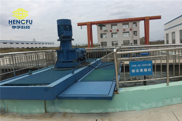 表面曝气机叶轮的淹没深度一般在10-100mm,并可以实现吃水深度的调节,淹没深度大时提升水量大,但所需功率也会增大。表曝机叶轮转速一般为20-100r/min,电机需通过齿轮箱变速,可进行二挡、三挡调速,以适应进水水量和水质的变化。根据叶轮结构形式,我国目前应用的这类表面曝气机有泵型、倒伞型、K型叶轮型。