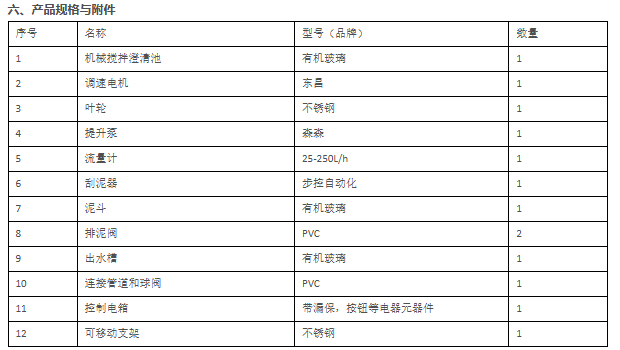 2.可调速冲激电机1台、调速器1台、叶轮1套、提升加速装置1套、沉淀装置1套、污泥斗2只、排泥阀2只、出水平衡槽1套;